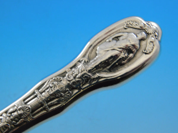 Sterling Silver hollow handle with blunt blade REGULAR KNIFE 8 5/8" in the pattern MYTHOLOGIQUE BY GORHAM. It is monogrammed (monos vary) and is in good vintage condition with some slight wear to the plated blade, condition commensurate with its age.