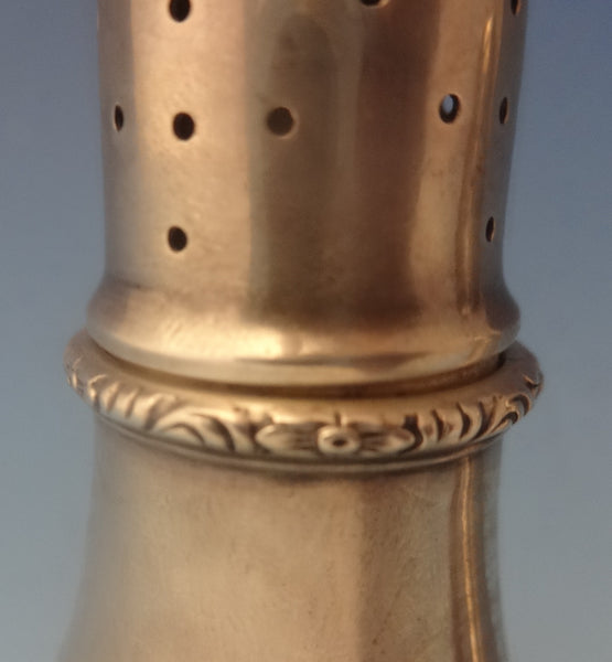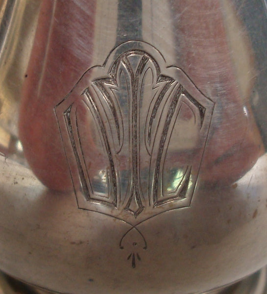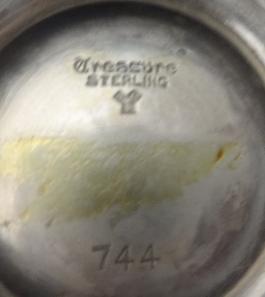 Elegant William and Mary by Lunt sterling salt and pepper shakers pair. The pieces have an "UC" monogram and are marked with #744. They date from the 1920's. The shakers measure 4 1/4" tall, 1 3/4" wide, and weigh 4.6 ozt. total for both pieces. They are in excellent condition. Beautiful! SKU#0239.