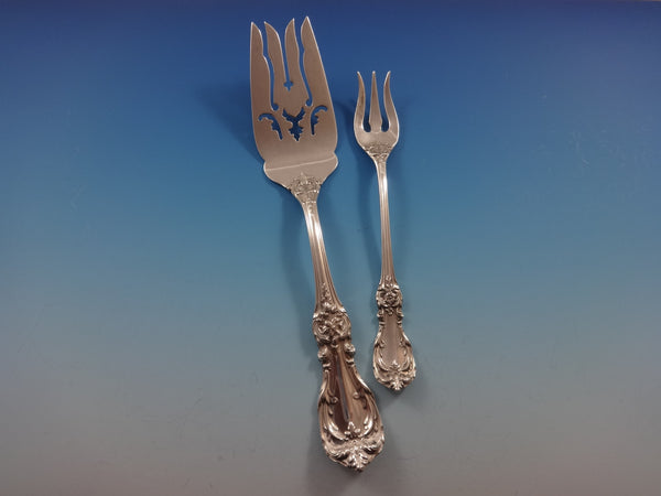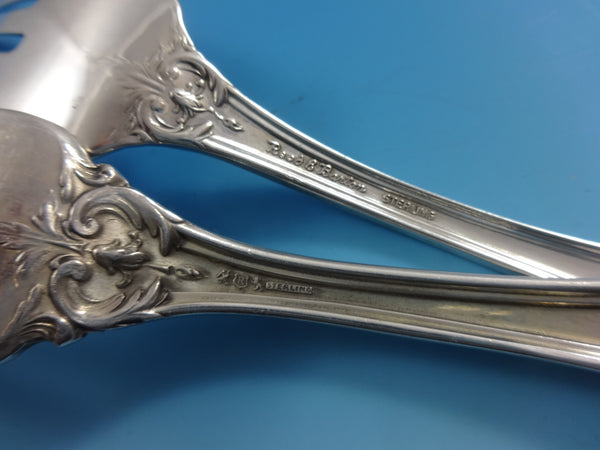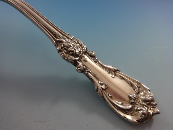 Monumental BURGUNDY BY REED BARTON sterling silver DINNER SIZE Flatware set - 157 Pieces. This set includes:18 DINNER SIZE KNIVES, 9 3/4" 18 DINNER SIZE FORKS, 7 3/4" 18 SALAD FORKS, 6 1/2" 18 TEASPOONS, 6" 18 FLAT HANDLE BUTTER SPREADERS, 5 3/4" 18 COCKTAIL FORKS, 5 1/2" 18 ICED TEA SPOONS, 7 1/2" 18 DEMITASSE SPOONS, 4 1/4" 1 GRAVY LADLE, 6 3/8" 1 SERVING SPOON, 8 1/8" 1 PIERCED SERVING SPOON, 8 1/4" 1 COLD MEAT FORK, 7 7/8" 1 SUGAR SPOON, 6 1/4" 1 FLAT HANDLE MASTER BUTTER KNIFE, 7" 1 PICKLE FORK, 5 3/4" 1 TOMATO SERVER, 8" 1 SALAD SERVING SET, ALL-STERLING, 9 1/4" 1 PIE SERVER W/STAINLESS BLADE, 10 1/4" 1 SAUCE LADLE, 5 1/2" 1 NUT SPOON, 4 1/2"