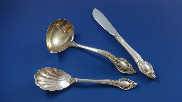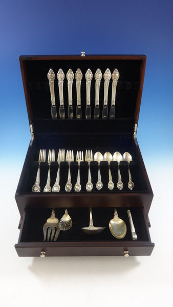 Beautiful CAMEO by Reed Barton STERLING SILVER flatware set, 37 pieces. This set includes:8 KNIVES, 9" 8 FORKS, 7 3/8" 8 SALAD FORKS, 6 5/8" 8 TEASPOONS, 6 1/8" 1 GRAVY LADLE, 6 5/8" 1 SERVING SPOON, 8 1/2" 1 COLD MEAT FORK, 8 1/2" 1 SUGAR SPOON, 6 3/8" 1 HOLLOW HANDLE MASTER BUTTER, 7 3/8" Includes bonus brand new storage chest - styles vary.