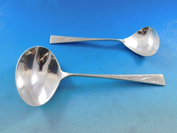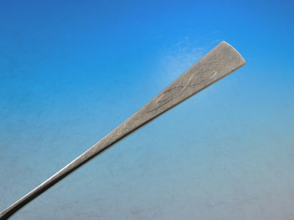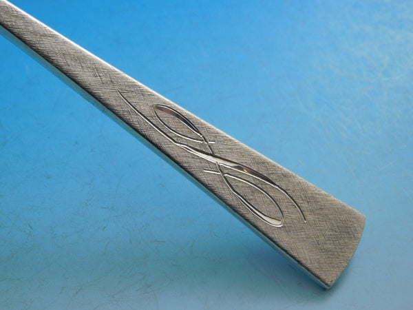 Excellent condition, not monogrammed. This scarce pattern has a modern design with elongated handles, matte finish, and engraved detailing. This set will be lightly polished and sealed in plastic sleeves prior to