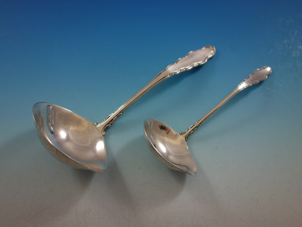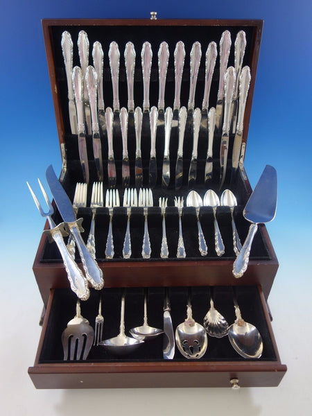 ENGLISH PROVINCIAL BY REED BARTON sterling silver Flatware set - 67 Pieces. This set includes:8 KNIVES, 9 1/8" 8 FORKS, 7 1/2" 8 SALAD FORKS, 6 3/4" 8 TEASPOONS, 6" 8 HOLLOW HANDLE BUTTER SPREADERS, 6 7/8" 8 COCKTAIL FORKS, 5 5/8" 8 STEAK KNIVES W/STAINLESS BLADES, 9 3/4" 1 GRAVY LADLE, 6 5/8" 1 SERVING SPOON, 8 1/2" 1 PIERCED SERVING SPOON, 8 1/2" 1 COLD MEAT FORK, 8 3/8" 1 SUGAR SPOON, 6 1/4" 1 HOLLOW HANDLE MASTER BUTTER, 7 1/4" 1 LEMON FORK, 4 7/8" 1 PIE SERVER W/STAINLESS BLADE, 11" 1 SAUCE LADLE, 5 1/2" 1 ROAST CARVING SET, 2-PC, 14" Includes bonus brand new storage chest - styles vary.
