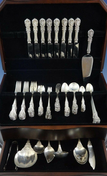 8 KNIVES, FRENCH BLADES, 9 1/4" 8 FORKS (HEAVY), 7 1/4" 8 SALAD FORKS, 6 1/8" 8 TEASPOONS (HEAVY), 6" 8 CREAM SOUP SPOONS, 6" 8 FLAT HANDLE BUTTER SPREADERS, 5 7/8" 8 COCKTAIL FORKS, 5 5/8" 8 ICED TEA SPOONS, 7 5/8" 8 DEMITASSE SPOONS, 4 1/4" 8 ICE CREAM FORKS, ORIGINAL, 5 1/4" 1 GRAVY LADLE, 6 5/8" 1 SERVING SPOON, 8 3/8" 1 PIERCED SERVING SPOON, 8 3/8" 1 SUGAR SPOON, 6" 1 PIE SERVER W/STAINLESS BLADE, 10 1/4" 1 JELLY SERVER, 5 7/8" 1 BERRY SPOON, ALL-STERLING, 9 3/8" Includes bonus brand new storage chest - styles vary.