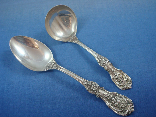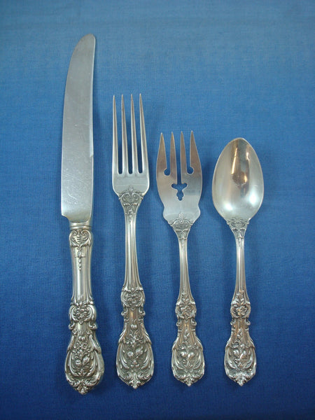 Often called America's most glorious sterling silver flatware pattern, Francis I is a true work of art. Each piece's central decoration represents a different cluster of fruit and flowers, giving your table a unique and classic presentation. This is one of the most popular silver flatware patterns of all time. This set has old hallmarks and crisp pattern detailing.