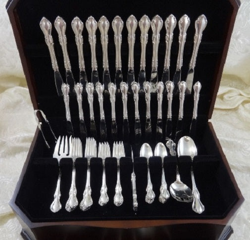 12 KNIVES, 9 1/8" 12 FORKS, 7 1/2" 12 SALAD FORKS, 6 5/8" 12 TEASPOONS, 6" 12 HOLLOW HANDLE BUTTER SPREADERS, 6 3/8" 1 SERVING SPOON, 8 5/8" 1 PIERCED SERVING SPOON, 8 5/8" 1 COLD MEAT FORK, 8 5/8" 1 HOLLOW HANDLE MASTER BUTTER KNIFE, 7" 1 SUGAR TONGS, 4 1/4" Includes bonus brand new storage chest - styles vary.