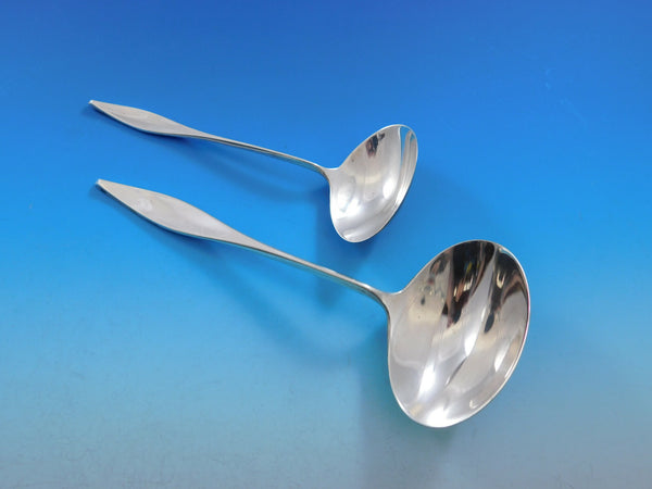 Lark by Reed Barton sterling silver flatware set, 50 pieces. This set includes:8 Knives, 9" 8 Forks, 7 5/8" 8 Salad Forks, 7" 8 Teaspoons, 6 1/4" 8 Hollow Handle Butter Spreaders, 6 7/8" 1 Gravy Ladle, 7 1/4" 1 Serving Spoon, 8 3/8" 1 Pierced Serving Spoon, 8 3/8" 1 Cold Meat Fork, 8 1/4" 1 Sugar Spoon, 6 1/4" 1 Hollow Handle Master Butter, 7 3/8" 1 Salad Serving Set, 2-pc, with black nylon implements, 13" 1 Pie Server w/stainless blade, 10 3/4" 1 Sauce Ladle, 5 7/8" Includes bonus brand new storage chest - styles vary.