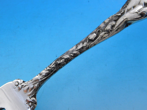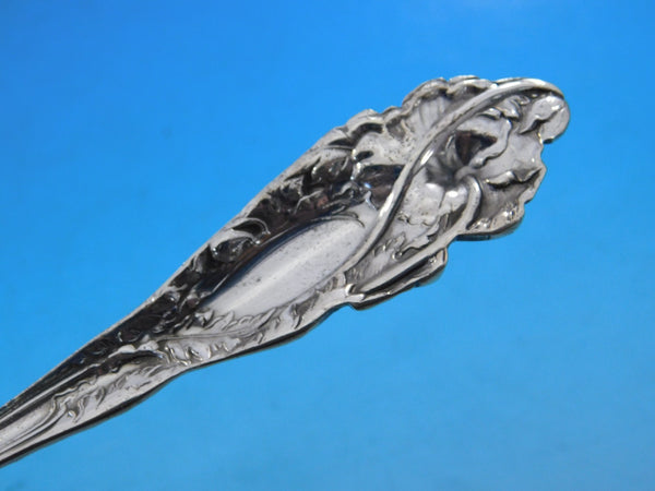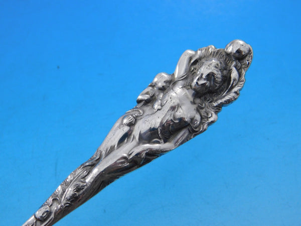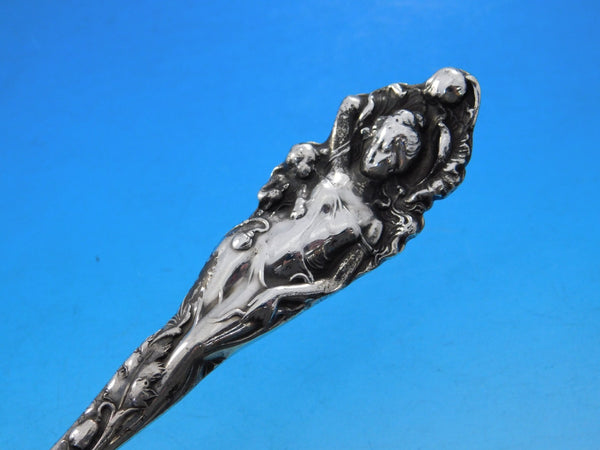 It was design genius on the part of Reed and Barton to so perfectly capture the story of disarming Cupid in sterling silver. While we are not sure who the beautiful figure of Cupid's conqueror in the Love Disarmed pattern was intended to be, we surmise it is either Venus, Diana, or a nymph. Most likely she is hiding Cupid's quiver of arrows with her left arm while she holds his bow away from him with her right. Love Disarmed is widely considered the finest Art Nouveau pattern ever made.