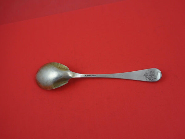 Sterling Silver Berry Spoon , pointed and light gold washed 9" in the pattern Antique Engraved by Tiffany - also known as Custom Engraved by Tiffany. It is monogrammed (monos vary) and is in good vintage condition. The gold-wash on the bowl is worn, as shown. We can polish the gold wash off, if desired, upon request.