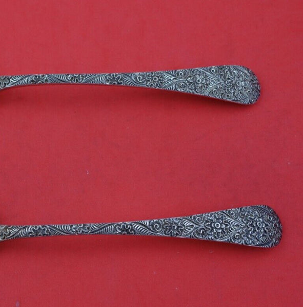 Sterling silver original Salad Serving Set 2-Piece Gold Washed 9 1/2" in the pattern Antique Engraved aka Custom Engraved by Tiffany and Co. It is monogrammed on the reverse (monos vary) and is in excellent condition.