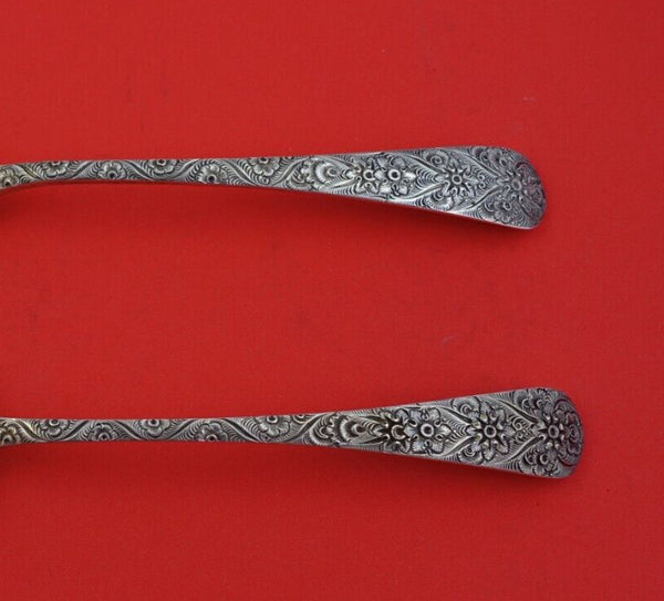 Sterling silver flat handle all sterling Salad Serving Set 2-Piece Long 9 1/2" in the pattern Antique Engraved aka Custom Engraved by Tiffany and Co. It is not monogrammed and is in excellent condition.