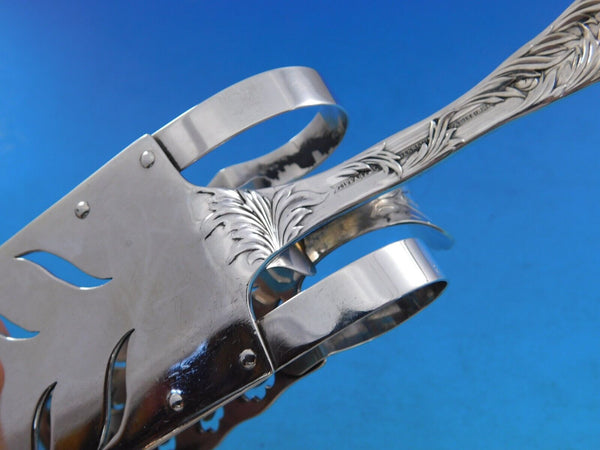 Exceedingly rare Sterling silver Sandwich Tong, mechanical style with two 'C'-springs, 9 7/8", in the pattern Chrysanthemum by Tiffany Co. It is monogrammed "M" and is in excellent condition. The flat pierced rectangular serving area of the tongs is activated to open by forward pressure on a thumbpiece. Exceptional!