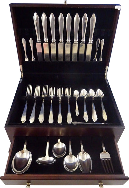 CLINTON BY TIFFANY CO. sterling silver Flatware set - 60 Pieces. This pattern has a fabulous, clean, timeless design. This set includes:8 KNIVES, 9 1/4" 8 FORKS, 7" 8 SALAD FORKS, 6 3/4" 8 TEASPOONS, 6" 8 CREAM SOUP SPOONS, 6 5/8" 8 FLAT HANDLE BUTTER SPREADERS, 5 7/8" 8 DEMITASSE SPOONS, 4 1/4" 1 GRAVY LADLE, 7 1/2" 1 SERVING SPOON, 8 5/8" 1 COLD MEAT FORK, 8 1/2" 1 VEGETABLE SERVING SPOON, 9 1/4" Includes bonus brand new storage chest - styles vary.
