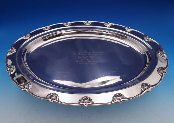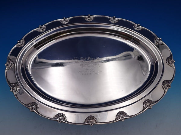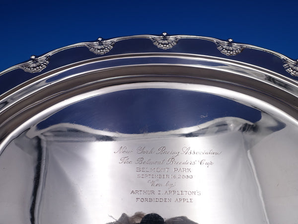 Stunning English King by Tiffany and Co sterling silver trophy platter marked #11742/146. This trophy platter has an inscription that reads, "New York Racing Association The Belmont Breeders' Cup Belmont Park September 16, 2000 Won by Arthur I. Appleton's Forbidden Apple" (see photos).