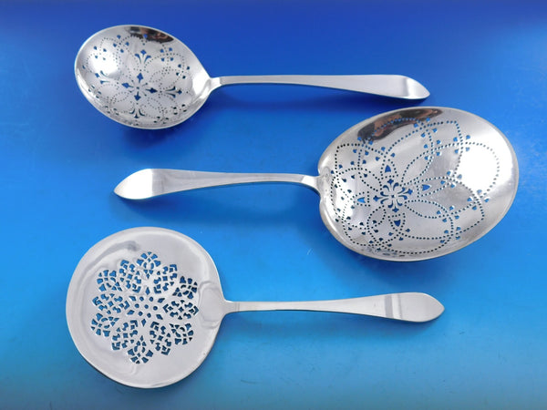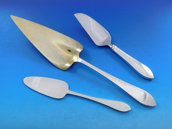12 Dinner Size Knives, 10 1/4"12 Dinner Size Forks, 7 1/2"12 Regular Knives, 9 3/8"12 Regular Forks, 7 1/8"12 Salad Forks, 6 5/8"12 Teaspoons, 6"12 Cream Soup Spoons, 6 3/4"12 Gumbo Soup Spoons, 7"12 Flat Handle Butter Spreaders, 5 7/8"12 Cocktail Forks, 6"12 Iced Tea Spoons, 7 1/2"12 Bouillon Soup Spoons, 5 3/8"12 Ice Cream Forks, 5 7/8"12 Fish Forks, 7 5/8"12 Fruit Forks, 2-tine, 6 1/4"12 Pastry Forks, 6 1/8"12 Grapefruit Spoons, 5 7/8"12 Dinner/Serving Spoons, 8 3/4"1 Berry Spoon, square shoulders, 9"1 Gravy Ladle, 7 3/8"1 Cold Meat Fork, straight tines, 8 5/8"1 Cold Meat Fork, splayed tines, pierced, 9"1 Cheese Server flat handle all-sterling, 7"1 Cheese Server hollow handle with stainless blade, 7"1 Sugar Spoon, 6"1 Hollow handle Master Butter Knife, 7 1/8"1 Sugar Tong, 4"1 Lemon Fork, 4 1/4"1 Tomato Server, pierced, all-sterling, 7 7/8"1 Salad Set, long, gold-washed, 10"1 Pie Server. all-sterling, 11 1/4"1 Sauce Ladle, 7"1 Saratoga Chip Server, 8 7/8"1 Berry Spoon, 9"1 Pea Spoon, pierced, 9"1 Preserve Spoon, 7 1/4"1 Large Vegetable Serving Spoon, 9 5/8" Includes a new 2-Drawer (not Tiffany) storage chest - styles vary.