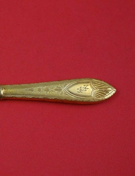 Sterling silver vermeil (completely gold washed) hollow handle with blunt blade Breakfast Knife, 8" in the pattern Faneuil Engraved by Tiffany and Co. It is monogrammed (monos vary) and is in excellent condition.