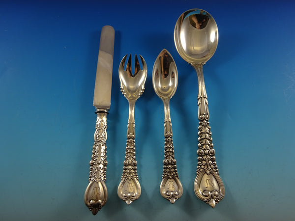 This set includes:12 Dinner Size Knives, 10 3/8" 12 Dinner Size Forks, 7 1/2" 12 Luncheon Knives, 9 3/8" 12 Luncheon Forks, 6 3/4" 12 Salad/Fish Forks, 6 3/4" 12 Teaspoons, 5 7/8" 12 Place Soup Spoons, 7 1/8" 12 Flat Handle Individual Butter Spreaders, 5 7/8" 12 Cocktail Forks, 5 1/2" 12 Breakfast knives, silverplated blades, 7 7/8" 12 Ice Cream Forks, 5 3/4" 12 Grapefruit Spoons, 5 3/4" 12 Gumbo Soup Spoons, 7 7/8" 2 Serving Spoons, 8 1/2" 1 All-Sterling Long Salad Set, gold-washed, 9 3/4" Includes bonus brand new storage chest - styles vary.