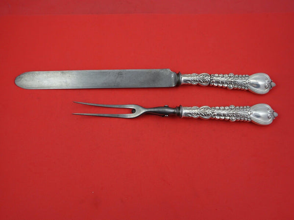 Sterling Silver Roast Carving Set 2-piece, knife 15" fork 11" in the pattern Florentine by Tiffany and Co. It is not monogrammed and is in as-shown condition with some wear to the steel implements as expected with age.