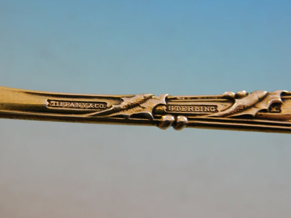 Beautiful sterling silver Hors D'Oeuvre Fork measuring 5 1/4" in the pattern Holly by Tiffany. This piece features beautiful holly leaves and berries throughout the handle and small piercings above the tines in the serving area. This piece is vermeil (completely gold-washed). It is not monogrammed and in excellent condition.