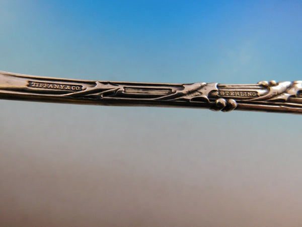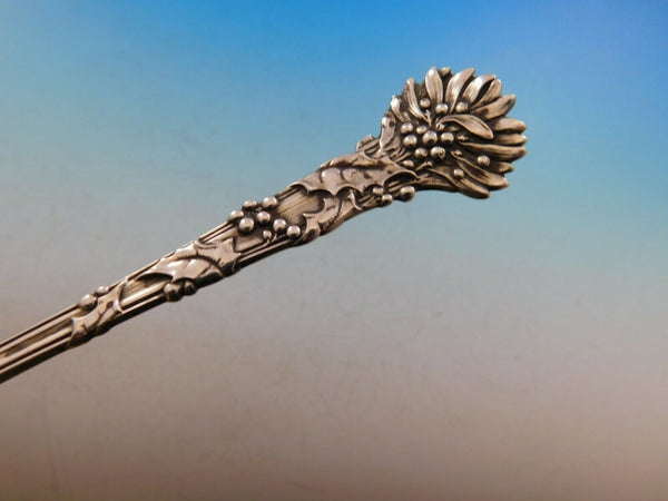 Intriguing sterling silver Olive Fork measuring 7" with 4-piercings in the pattern Holly by Tiffany. This piece features beautiful holly leaves and berries throughout the handle and piercings above the tine. It is not monogrammed and in excellent condition.
