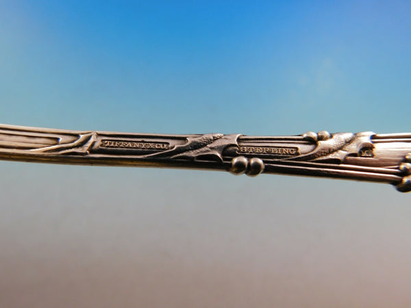 Intriguing sterling silver Olive Spoon measuring 6 7/8" in the pattern Holly by Tiffany and Co. This piece features beautiful holly leaves and berries throughout the handle and a beautifully floral design pierced gold-washed bowl. It is monogrammed on the reverse (monos vary) and in excellent condition.