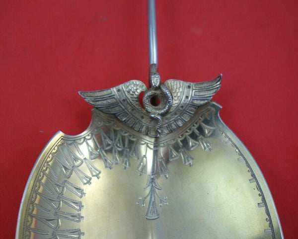 Sterling silver Ice Cream Serving Spoon Gold Washed 10 1/2" in the pattern Isis by Gorham. This piece has a block like handle at the end. At the base of the bowl sits a coiled snake and wings. This serving piece was retailed by Tiffany and Co and comes in a fitted box.