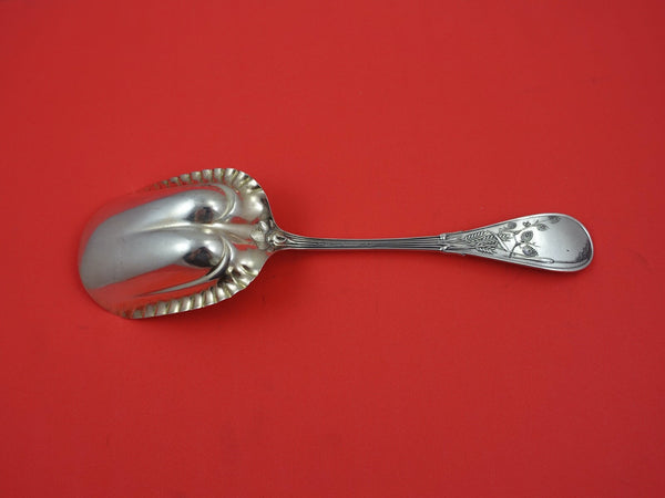 Beautiful sterling silver Cracker Scoop, gold washed with geometric design, 9 5/8" in the multi-motif pattern Japanese by Tiffany and Co. The handle of this piece features a Japonesque bird perched on a branch, surrounded by foliage. It is not monogrammed and is in excellent condition.