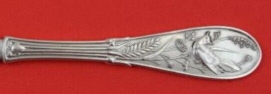 Beautiful sterling silver flat handle all sterling Citrus Knife Serrated 7 3/4" in the multi-motif pattern Japanese by Tiffany and Co. The handle of this piece features a Japanesque bird perched on a branch, surrounded by foliage. It is monogrammed on the reverse (monos vary) and is in excellent condition.