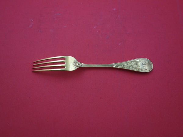 Masterfully crafted sterling silver Dinner Fork, vermeil 8 1/8" in the pattern Japanese by Tiffany and Co. The handle of this piece features a lovely bird perched on a branch, surrounded by foliage. It is monogrammed (monos vary) and is in excellent condition.