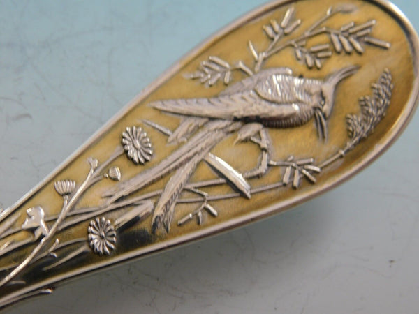 Extraordinary sterling silver Fish Server measuring 11 1/2" in the pattern Japanese by Tiffany and Co. The handle of this piece features a lovely bird perched on a branch, surrounded by foliage. This piece is vermeil (completely gold-washed) with a silver bird on the handle. The beautifully gold-washed serving area features a pie crust edge. It is not monogrammed and is in excellent condition.
