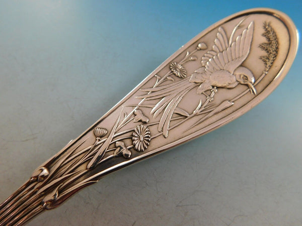 Stunning sterling silver Soup Ladle measuring 12 3/4" in the pattern Japanese by Tiffany and Co. The handle of this piece features a lovely bird perched on a branch, surrounded by foliage. It is monogrammed (mono on reverse/monos vary) and is in excellent condition.