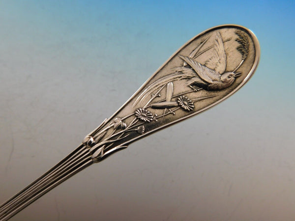 Masterfully crafted sterling silver Sugar Sifter measuring 7" in the pattern Japanese by Tiffany and Co. The handle of this piece features a lovely bird perched on a branch, surrounded by foliage. This piece features a beautifully gold-washed flower shaped bowl with piercings. It is monogrammed (see photo) and is in excellent condition.