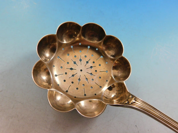 Stunning sterling silver Sugar Sifter measuring 7" in the pattern Japanese by Tiffany and Co. The handle of this piece features a lovely bird perched on a branch, surrounded by foliage. This piece is light vermeil (gold-washed all over) and features a flower like bowl with lovely piercings. It is monogrammed on the reverse (monos vary) and is in excellent condition.