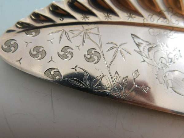 Intricately detailed sterling silver Crumber measuring 13 3/4" in the pattern Japanese by Tiffany and Co. The handle of this piece features a lovely bird perched on a branch, surrounded by foliage. The large serving area features a pie crust edge and stunning brite-cut engraving of a rooster and hen with chicks, clouds, flora as well as symbols. It is not monogrammed and is in excellent condition.