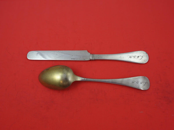 Sterling Silver Junior Set 2-piece, Knife flat handle all sterling 7 1/8", Spoon stippled brite-cut and gold washed 6 1/8" in the pattern King William Engraved by Tiffany Co.. It is monogrammed (monos vary) and is in excellent condition.