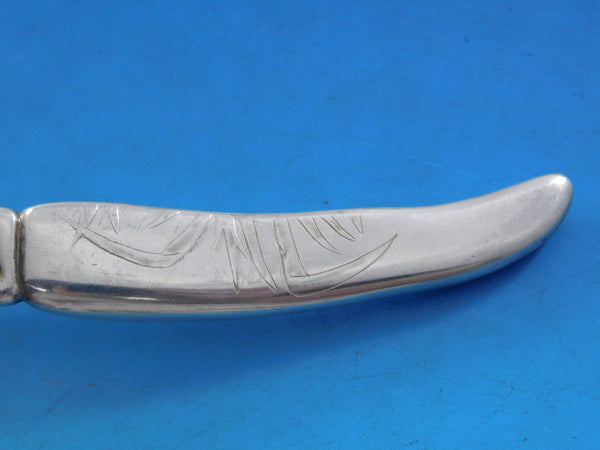 Sterling silver hollow handle, all-sterling, Fish Knife with engraved blade with bird and cattail motif 7 7/8" in the pattern Lap Over Edge Acid Etched By Tiffany Co. It is not monogrammed and is in excellent condition.