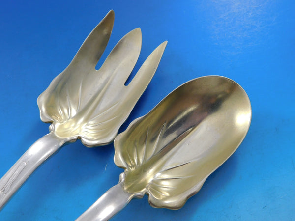 Sterling silver two piece Salad Serving Set, gold-washed, with bird on branch, owl, flowers, and leaves 10 1/2 " in the pattern Lap Over Edge Acid Etched By Tiffany Co. It is not monogrammed and is in excellent condition.