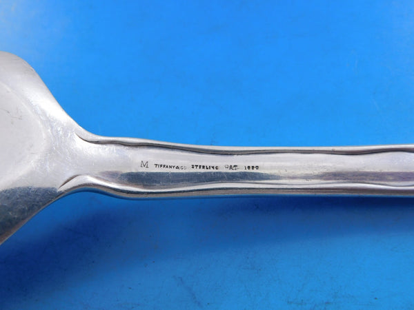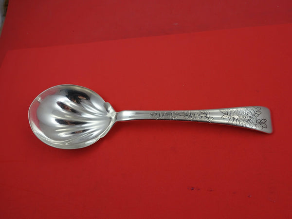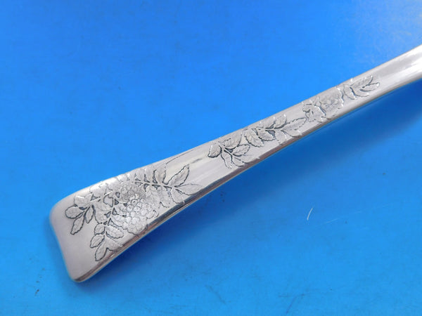 Sterling silver Berry Spoon, fluted bowl with raspberry motif 9" in the pattern Lap Over Edge Acid Etched by Tiffany and Co. It is monogrammed (monos vary) and is in excellent condition.