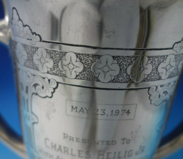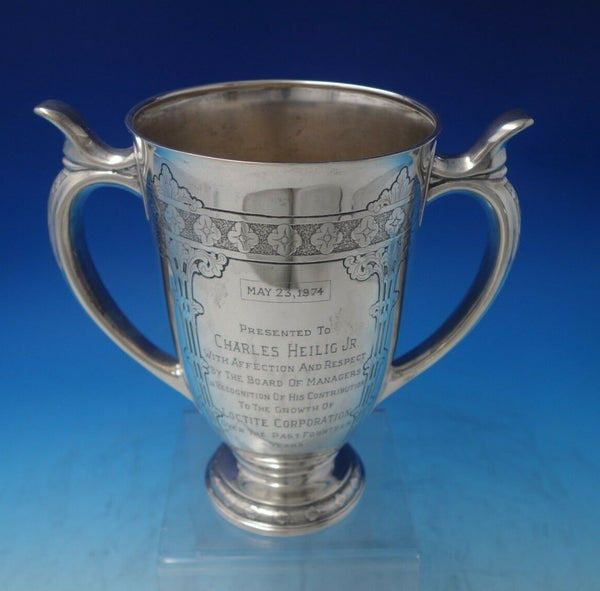 This piece measures 7 1/2" x 8 1/2" and weighs 24.6 troy ounces. It has a presentation inscription on the front to Charles Heilig Jr for his contributions and is dated May 23, 1974, and has signatures on the reverse. This piece is in good vintage condition. Incredible!