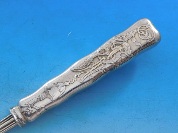 Sterling silver hollow handle with stainless implement Buffet Spoon 4-Tines with Mushrooms 9 7/8" in the pattern Lap Over Edge Acid Etched by Tiffany and Co. It is monogrammed (see photo), and is in excellent condition.