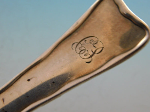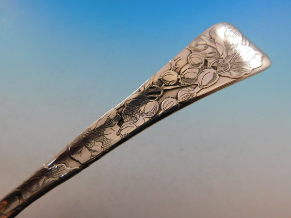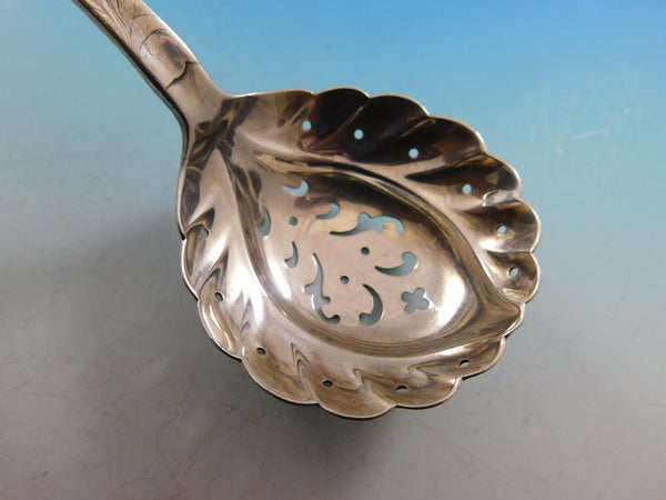 Beautiful sterling silver Sugar Sifter measuring 7" in the pattern Lap Over Edge Acid Etched by Tiffany. This multi-motif pattern is circa 1880 and features an array of designs from animals to fruits and vegetable to flowers. This piece features a stunning currant motif and lovely pierced bow. This piece is featured on page 226 in the "Tiffany Silver Flatware 1845-1905: When Dining Was an Art" by William P Hood Jr with Rosalyn Berlin and Edward Wawrynek. It is monogrammed (see photo) and in excellent condition.