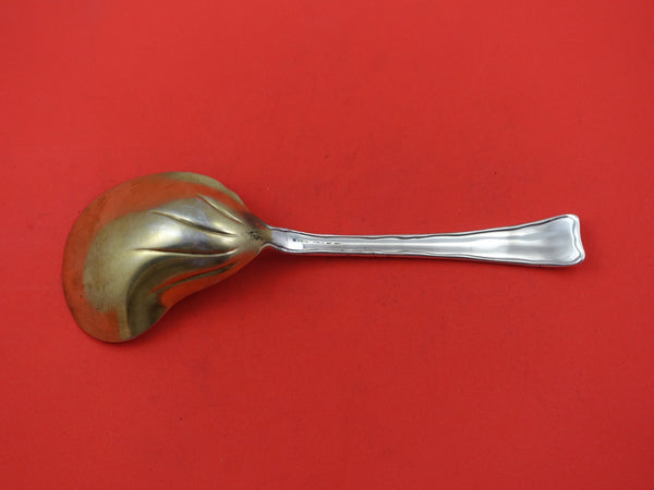 Stunning sterling silver Berry Spoon measuring 9 5/8" in the pattern Lap Over Edge Acid Etched by Tiffany. This multi-motif pattern is circa 1880 and features an array of designs from animals to fruits and vegetable to flowers. This piece features a flower / leaf motif on the handle and a gold-washed, conch shell shaped serving bowl. It is not monogrammed and is in excellent condition.