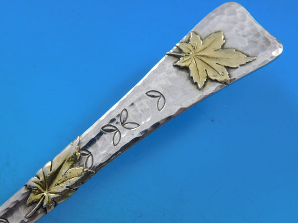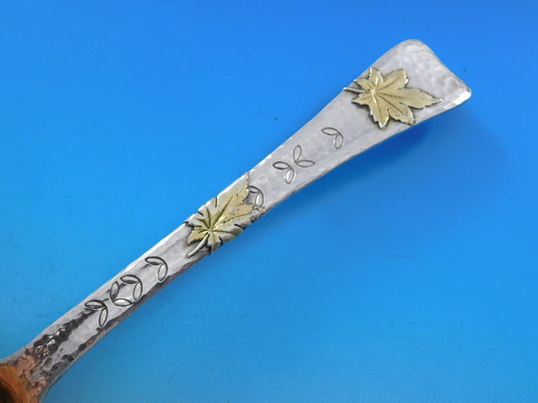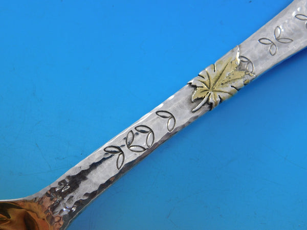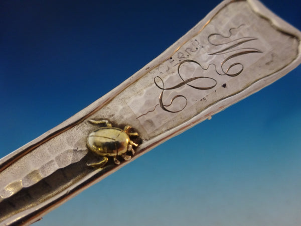Rare Sterling Silver Kidney Shaped Berry Spoon with gold-washed bowl 9 1/2" and applied elements in the pattern LAP OVER EDGE BY TIFFANY CO, circa 1880's. This piece has wonderful aesthetic applied elements including gold-washed oak leaves and a lady bug, as well as engraved leaf designs and faux chomping (as if the back of the handle was a leaf, partially eaten by the bug). It is monogrammed "ML" on the reverse and is in excellent condition.