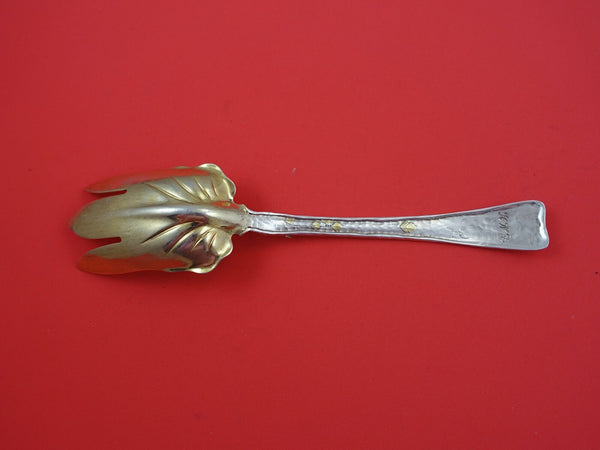 Sterling silver Salad Serving Fork with gold washed with beetle and iris flowers 9 1/8" in the pattern Lap Over Edge Mixed Metals by Tiffany and Co, circa 1880. This piece has wonderful aesthetic applied elements including a beetle and iris flower. The spoon has a mono on the reverse (see photo). This piece is in excellent condition. A work of art!