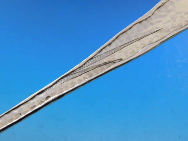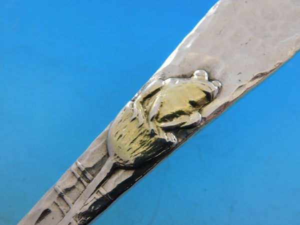 Sterling Silver Soup Ladle heart shaped bowl with gold frog sitting on lily pad, plants, and clouds, 11 1/2" In the pattern Lap Over Edge Mixed Metals by Tiffany Co. It is monogrammed (monos vary) and is in excellent condition.