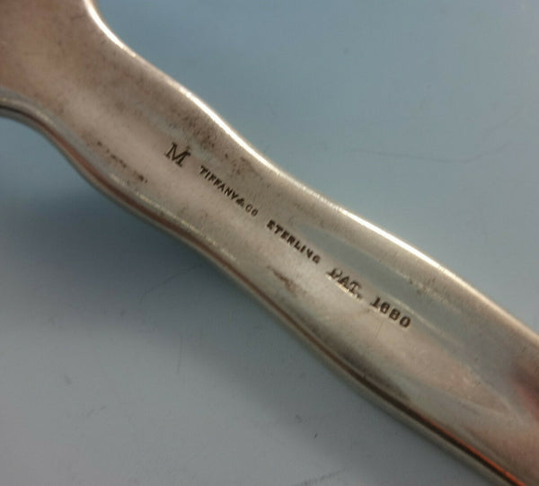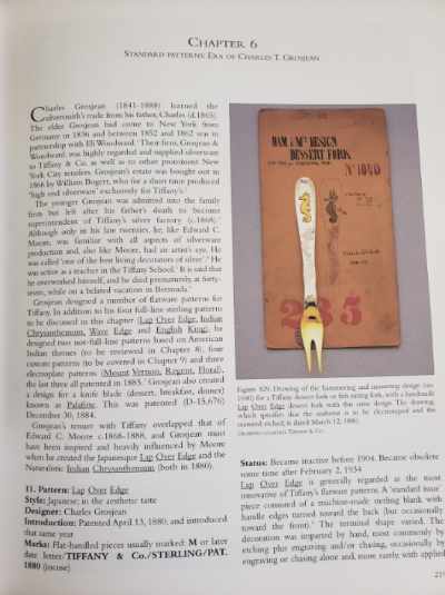 Designed by Charles Grosjean (1841-1888). Grosjean worked in his family's firm which produced high end silverware to prominent New York City retailers, including Tiffany. Upon his father's death, Grosjean left his family firm to become superintendent of Tiffany's silver factory in 1868. He had great background in silver and was an artist and was referred to as "one of the best living decorators of silver". He was a teacher in the Tiffany School and designed a few full lines of sterling patterns for Tiffany in his short time with the company before his unfortunate and sudden death. His patterns Chrysanthemum (formally Indian Chrysanthemum) and English King are some of the most famous of his designs, and of Tiffany in general.