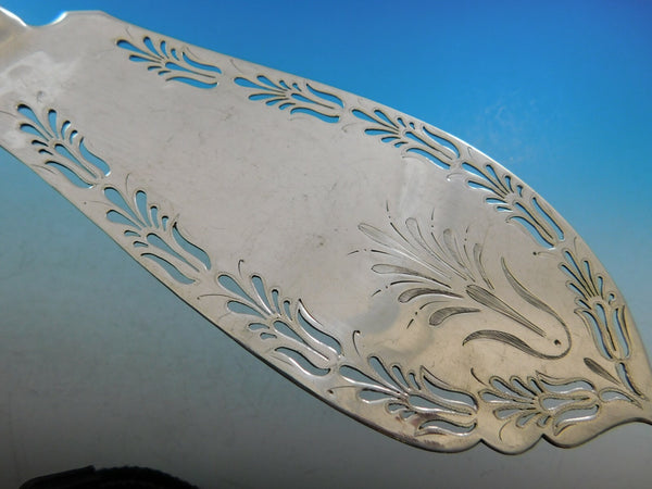 Masterfully crafted sterling silver Fish Server measuring 11 3/8" in the pattern Medallion by Gorham. This piece features a stunning pierced design around the boarder of the serving area as well as a lovely engraving on the blade. The handle has a medallion with man in helmet, with incredible detail. It is not monogrammed and is in excellent condition. Outstanding museum quality piece!