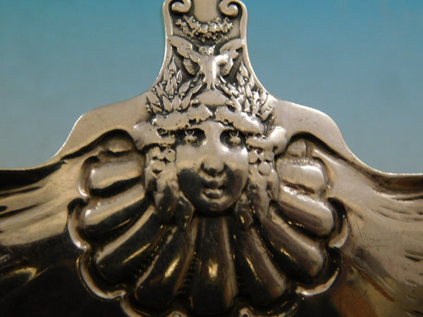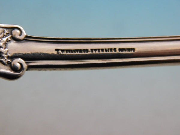 Stunning sterling silver Asparagus Serving Fork measuring 9 1/2" in the pattern Olympian by Tiffany and Co. The handle of this piece features the fourth motif in this pattern, which is Venus, born of the sea, being drawn into her shell by dolphins guided by Cupid. The back features emblems of love. This piece has lovely wavy tines. It is monogrammed (see photo) and is in excellent condition.