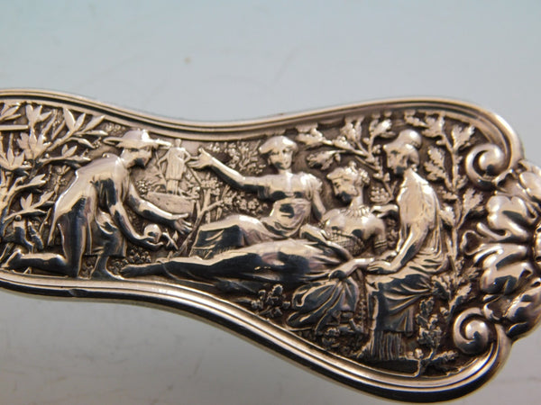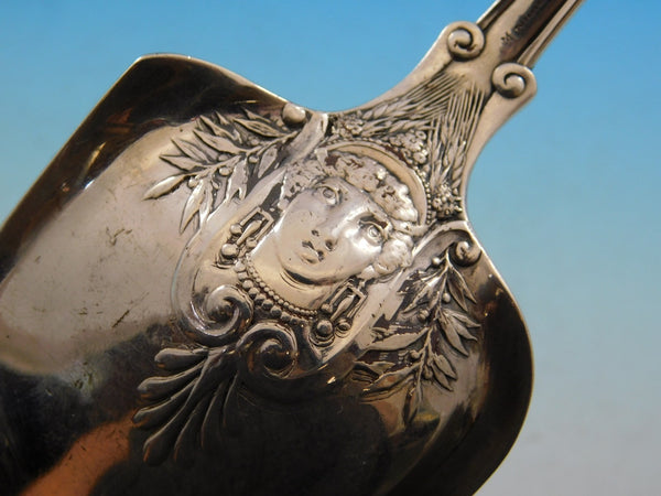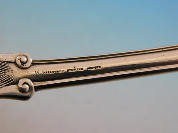 Stunning sterling silver Crumber measuring 11 5/8" in the pattern Olympian by Tiffany and Co. The handle of this piece features the third motif in this pattern, which is Paris, the son of Priam presenting to Venus the golden apple. This piece has a beautiful dolphin shaped serving area. It is monogrammed (see photo) and is in excellent condition.
