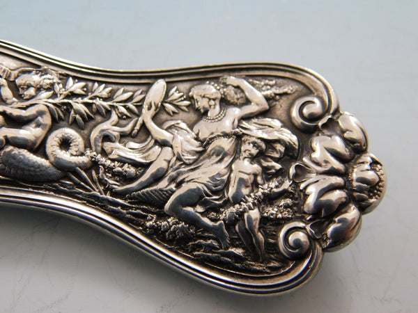Beautiful sterling silver Crumber measuring 12 1/2" in the pattern Olympian by Tiffany and Co. The handle of this piece features the fourth motif in this pattern, which is Venus, born of the sea, being drawn into her shell by dolphins guided by Cupid. The back features emblems of love. This piece has a lovely straight edge blade. It is not monogrammed and is in excellent condition.