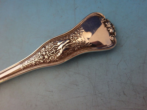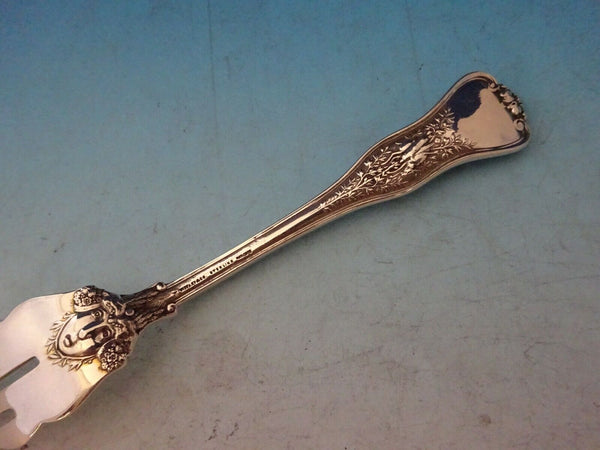 Sterling silver Pastry Fork / Dessert Fork 4-Tine Ruffled 6" in the multi-motif pattern Olympian by Tiffany and Co. It is monogrammed (although not showing in stock photo/monos vary) and is in excellent condition.